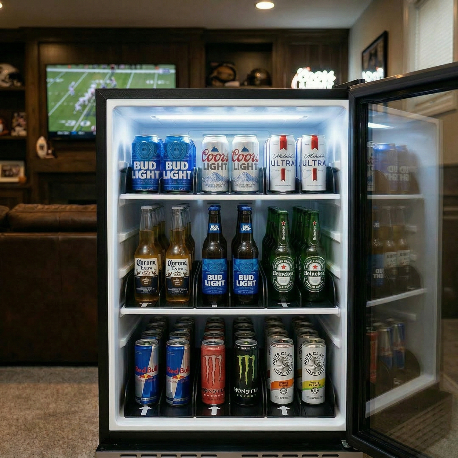 Yes — designed to accept most standard cans and bottles. Whether it’s soda, beer, or water, they slide through effortlessly without bending, stacking, or tipping.